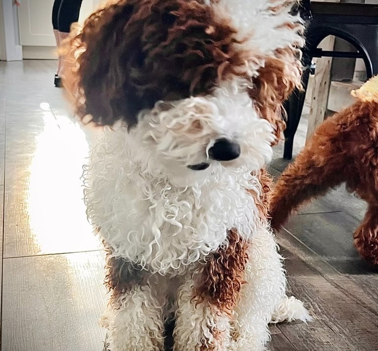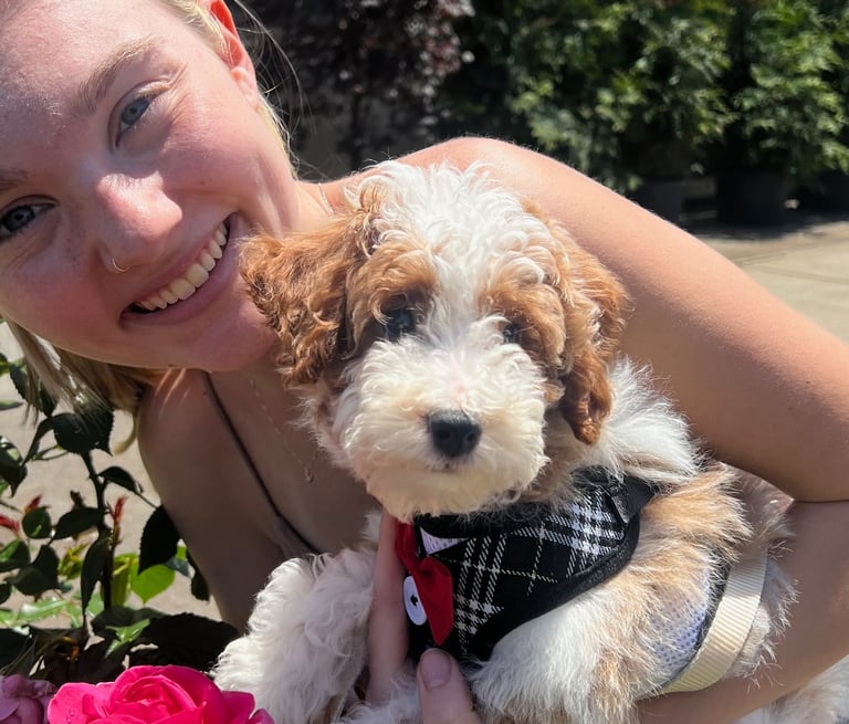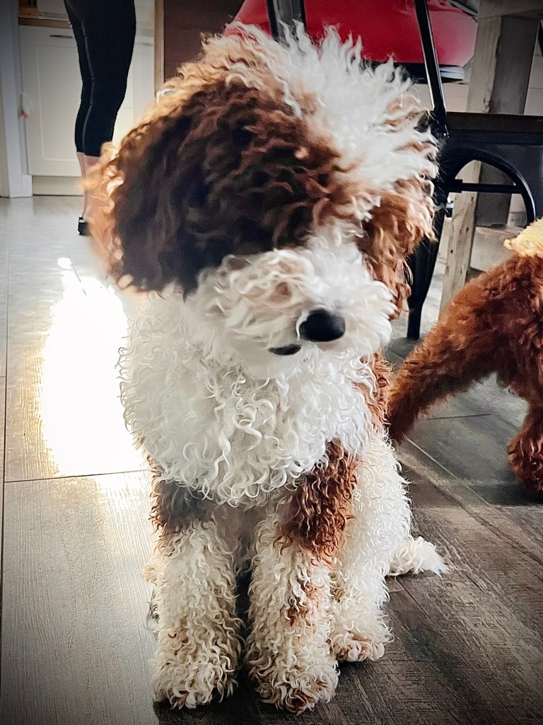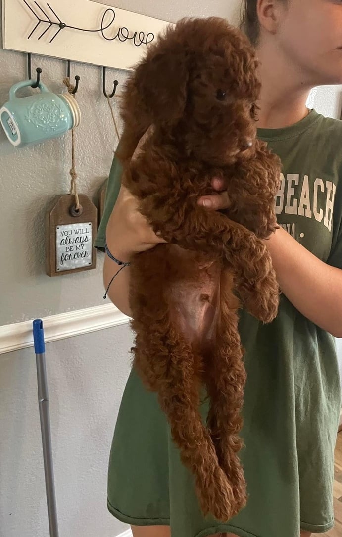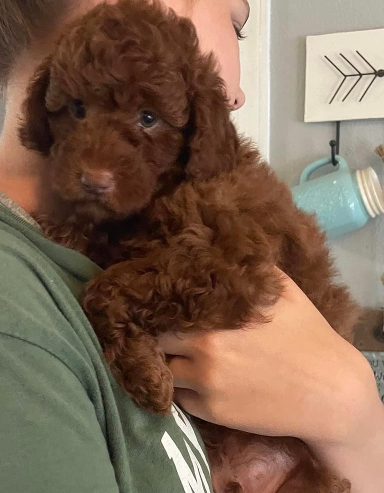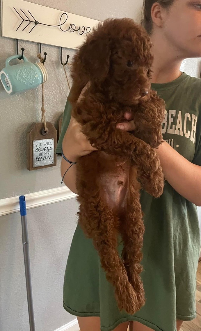 Sebastian is a 30 lb Moyen Poodle. He stands 19" tall & is as sweet as they come! He holds the Intense Red Rufus gene and produces stunning red babies with remarkable temperament. We are so blessed to have Sebastian as part of our program and family. Sebastian's loyalty is unmatchable. On walks, I do not have to leash him because he stays by my side and will only go 10 steps ahead of me before returning to make eye contact. Sebastian has the uncanny ability to get along with all of our other animals. He is so gentle and truly enjoys human companionship. His favorite thing...he loves to go for long rides and run around the lake.