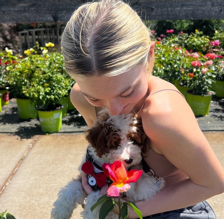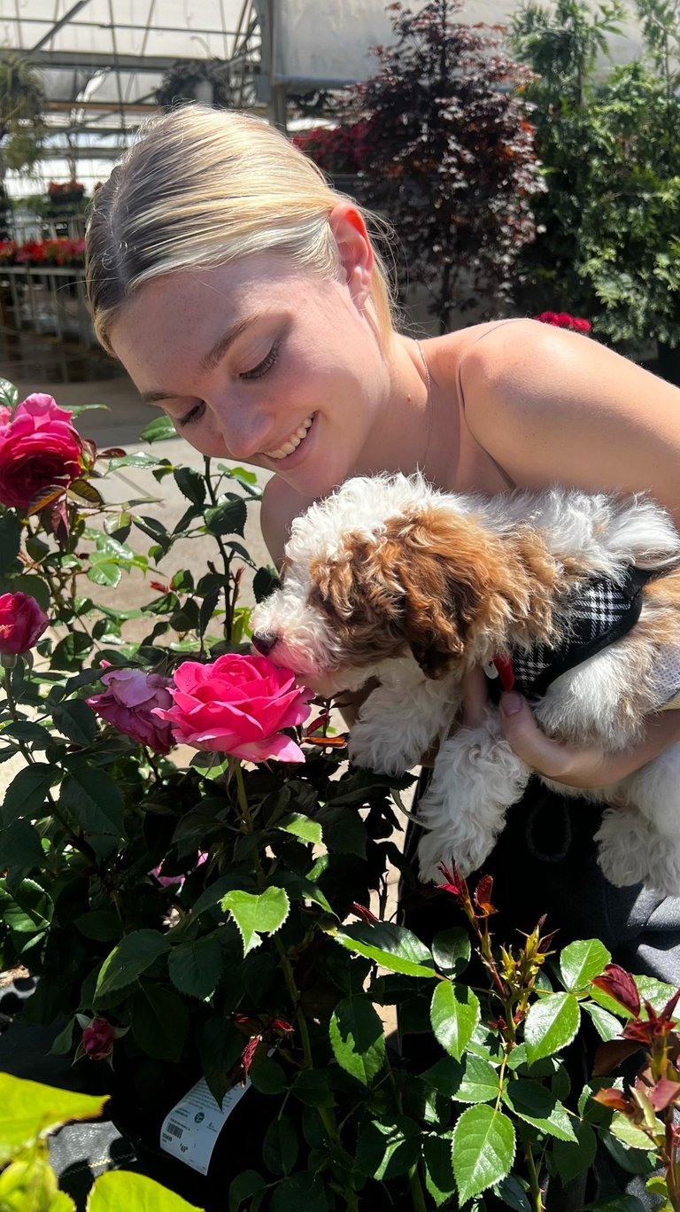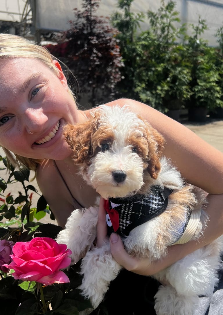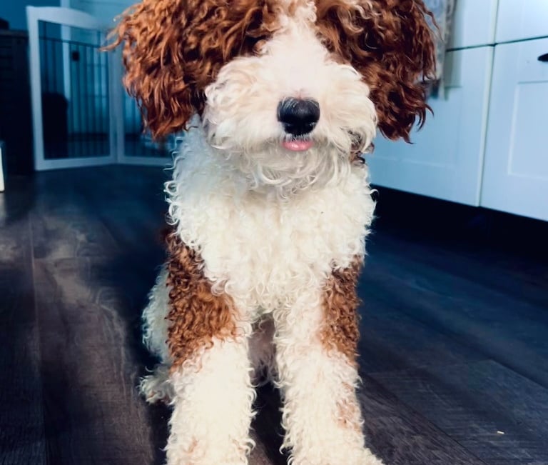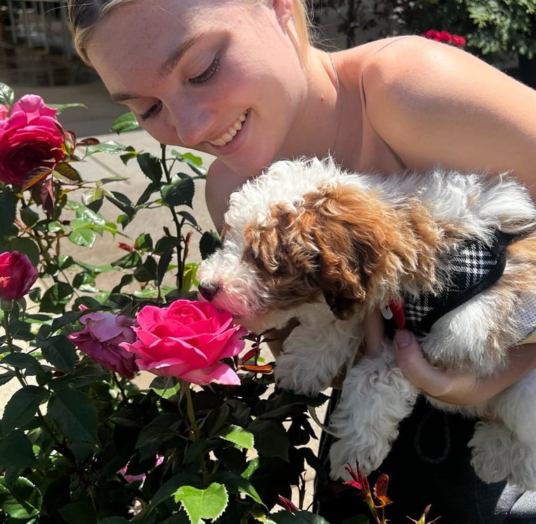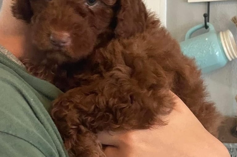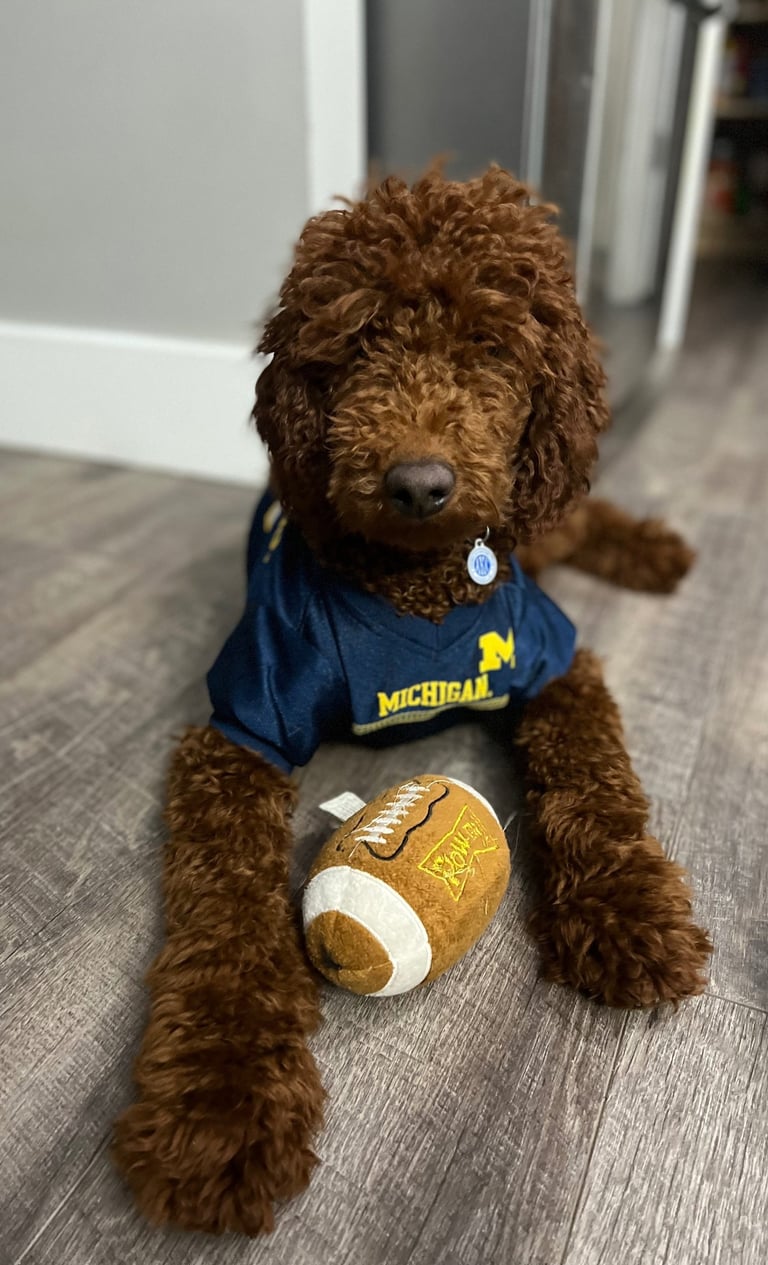 Sebastian is a 30 lb Moyen Poodle. He stands 19" tall & is as sweet as they come! He holds the Intense Red Rufus gene and produces stunning red babies with remarkable temperament. We are so blessed to have Sebastian as part of our program and family. Sebastian's loyalty is unmatchable. On walks, I do not have to leash him because he stays by my side and will only go 10 steps ahead of me before returning to make eye contact. Sebastian has the uncanny ability to get along with all of our other animals. He is so gentle and truly enjoys human companionship. His favorite thing...he loves to go for long rides and run around the lake.