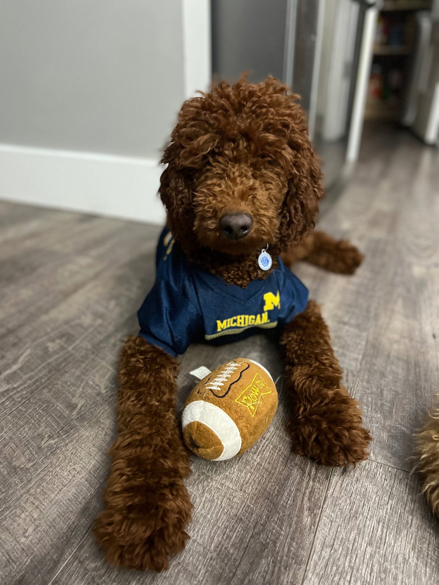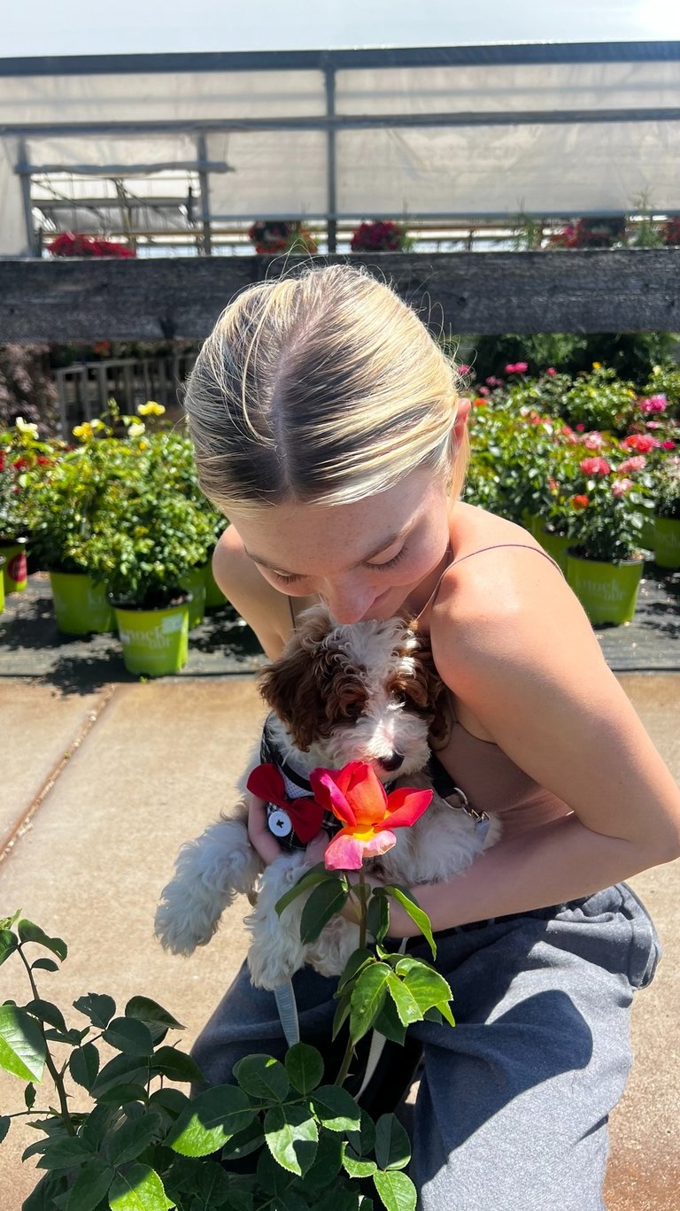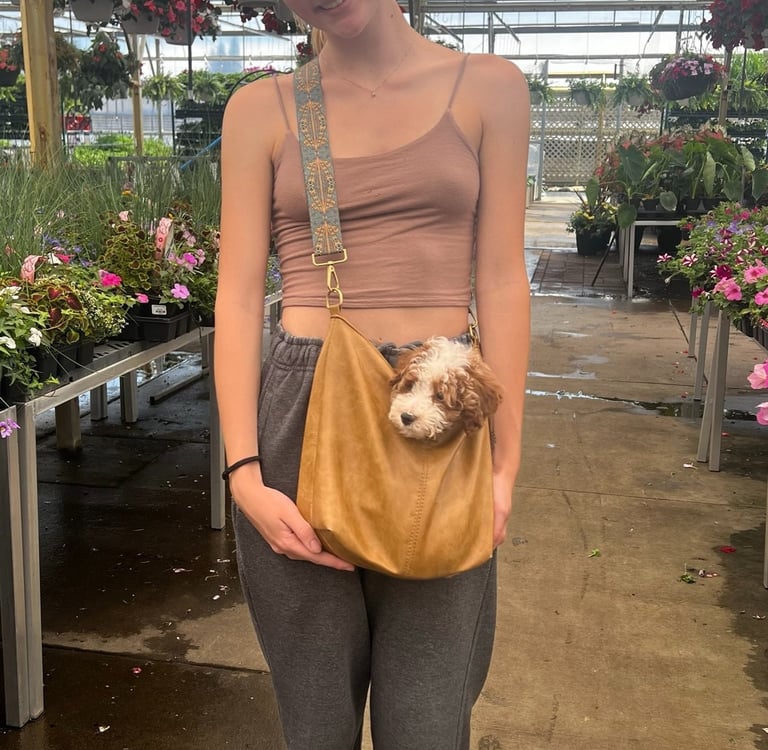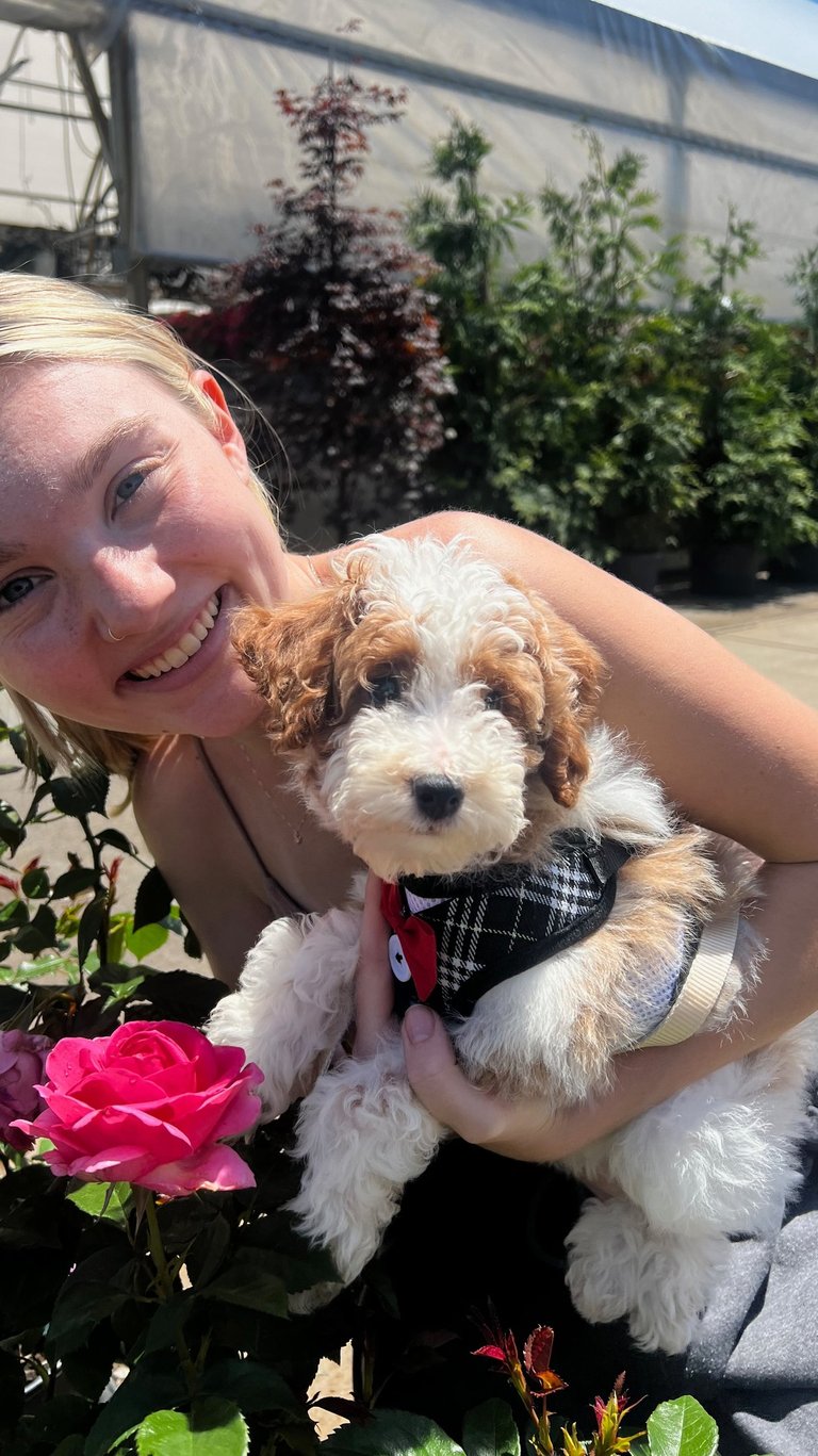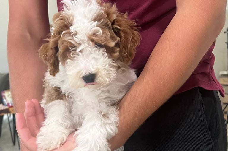 Sebastian is a 30 lb Moyen Poodle. He stands 19" tall & is as sweet as they come! He holds the Intense Red Rufus gene and produces stunning red babies with remarkable temperament. We are so blessed to have Sebastian as part of our program and family. Sebastian's loyalty is unmatchable. On walks, I do not have to leash him because he stays by my side and will only go 10 steps ahead of me before returning to make eye contact. Sebastian has the uncanny ability to get along with all of our other animals. He is so gentle and truly enjoys human companionship. His favorite thing...he loves to go for long rides and run around the lake.